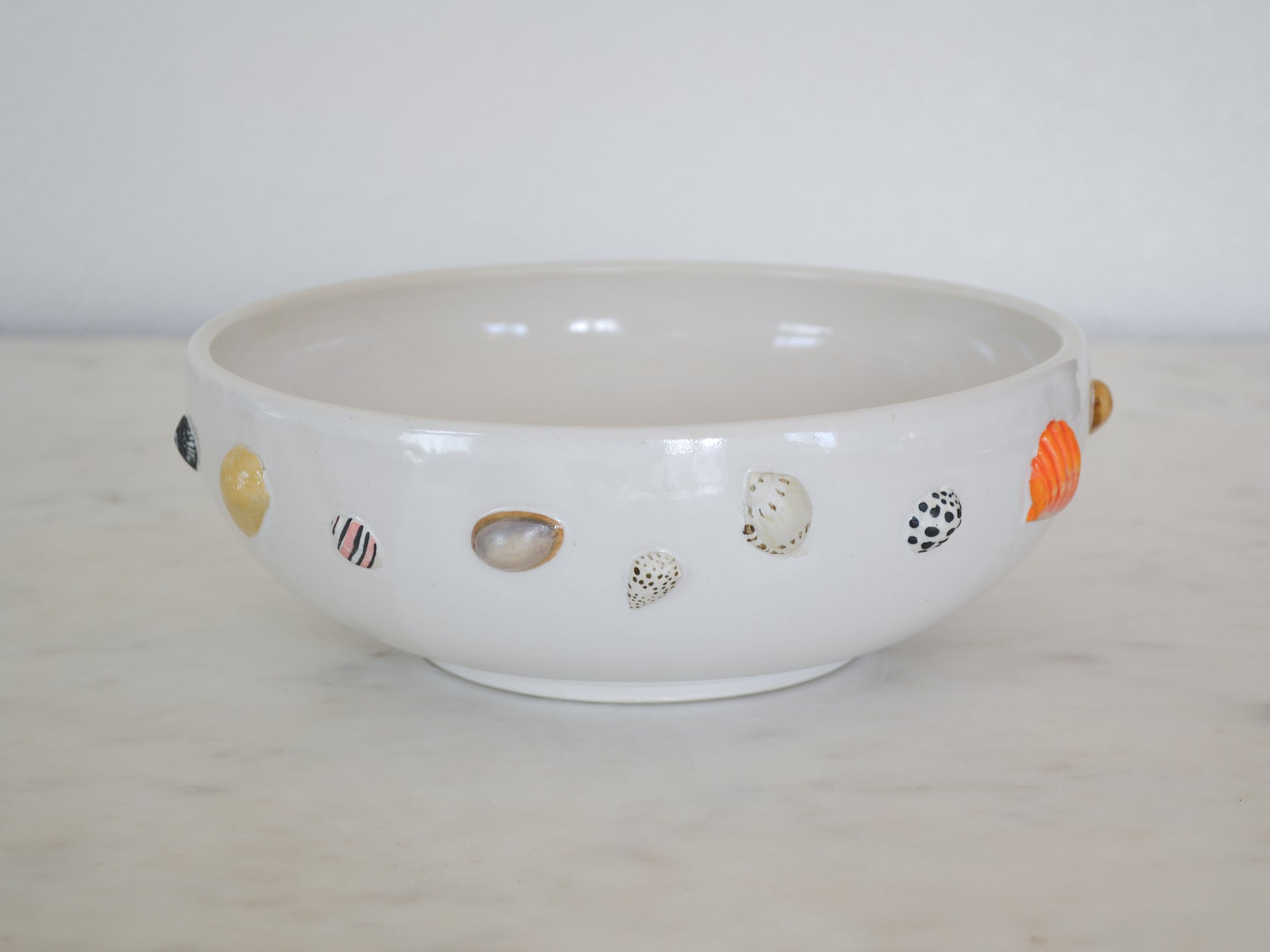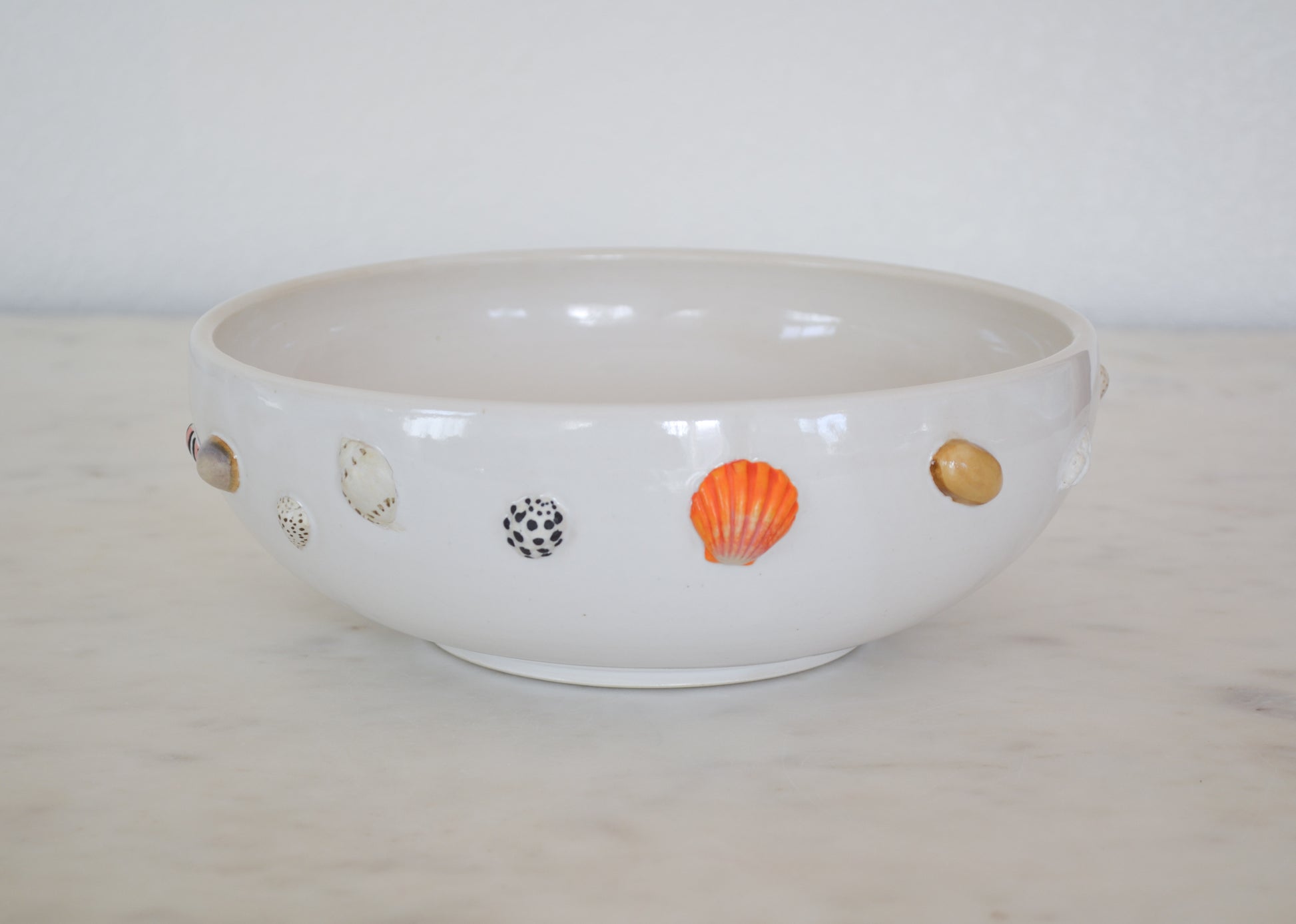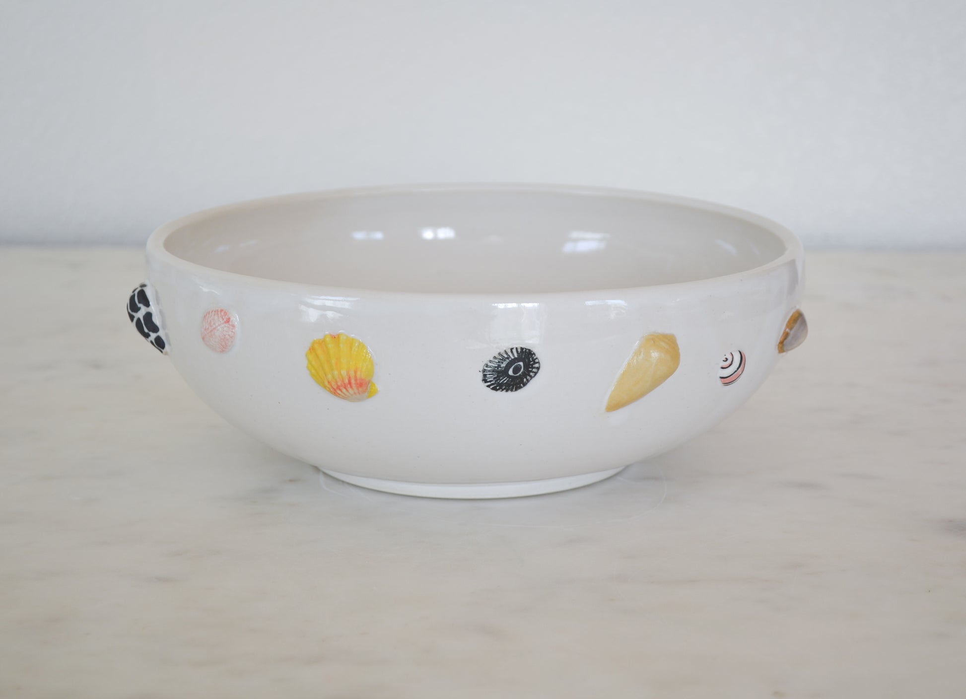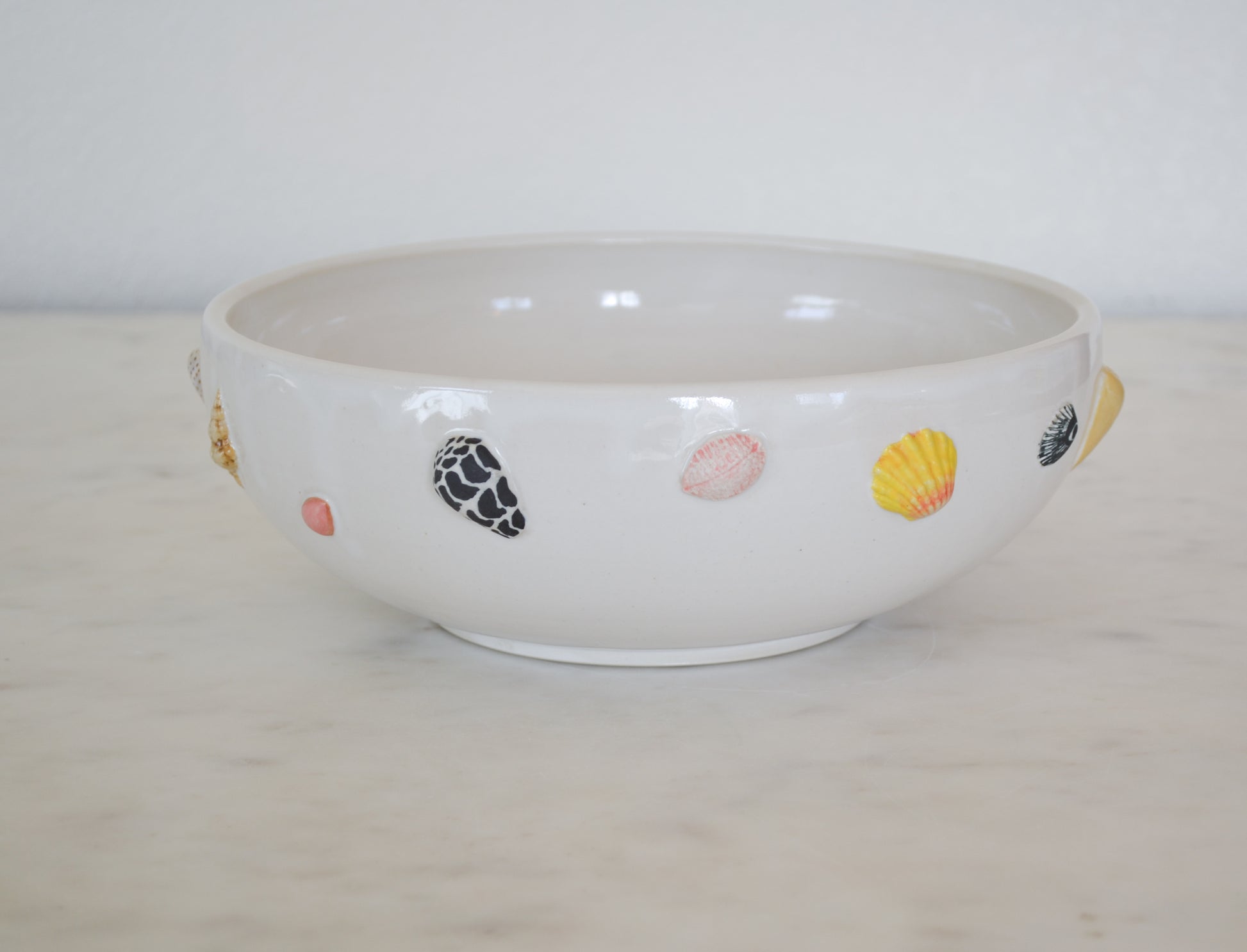 Hawaiian Shell Bowl is wheel thrown, hand painted, crafted with care by Courtney Puig. It features an assortment of shells. It is dishwasher and microwave safe. Each piece is wheel thrown and varies slightly. Width: 9.75", Height: 3.5"