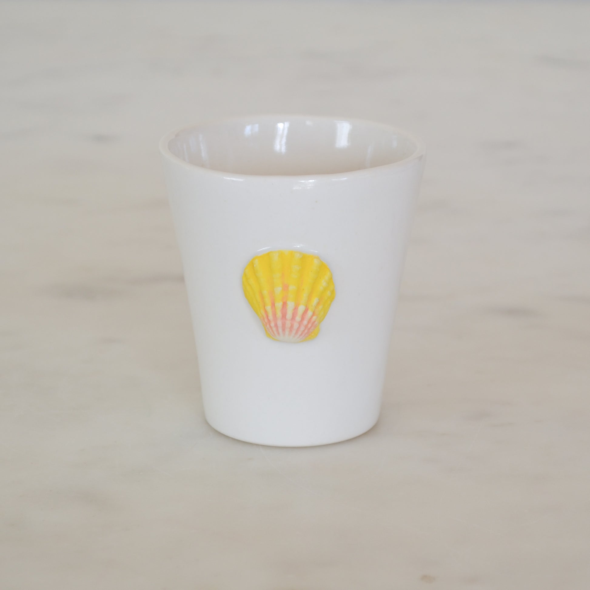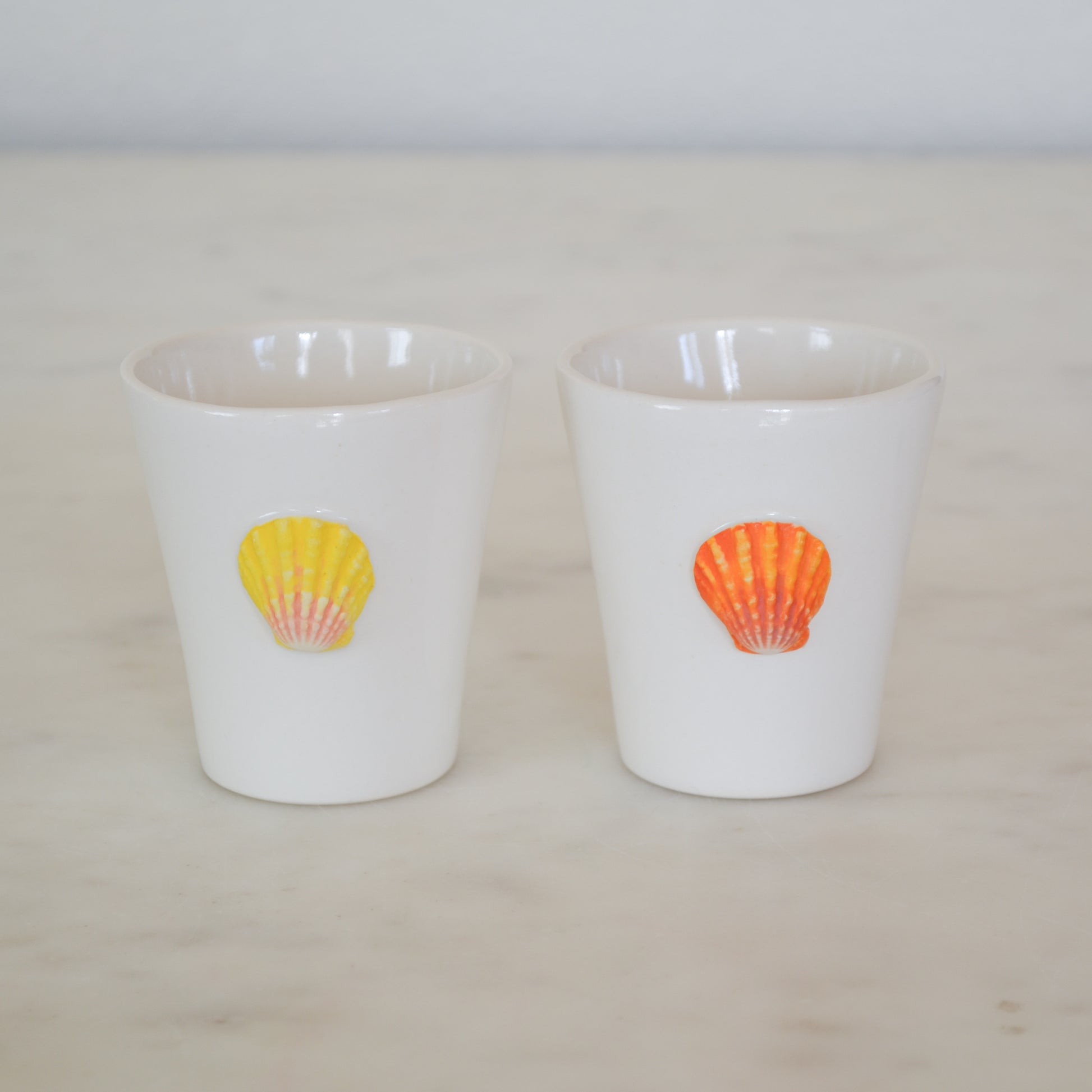 Sunrise shell cups, slip cast porcelain. Each holds around 4oz and features one Sunrise Shells. They are dishwasher and microwave safe. Width: 2.75", Height: 3"