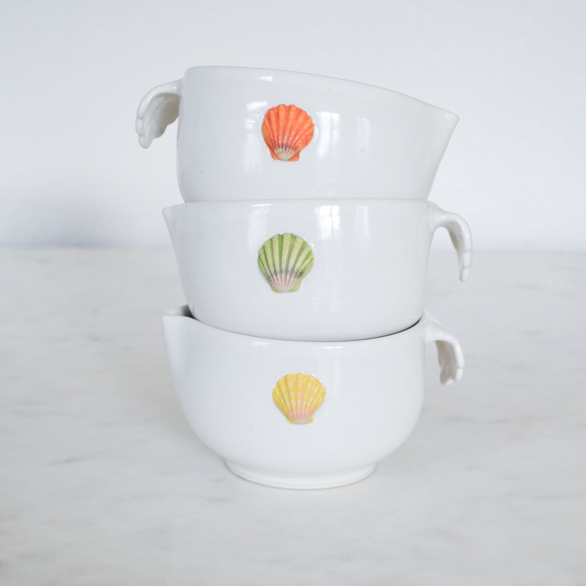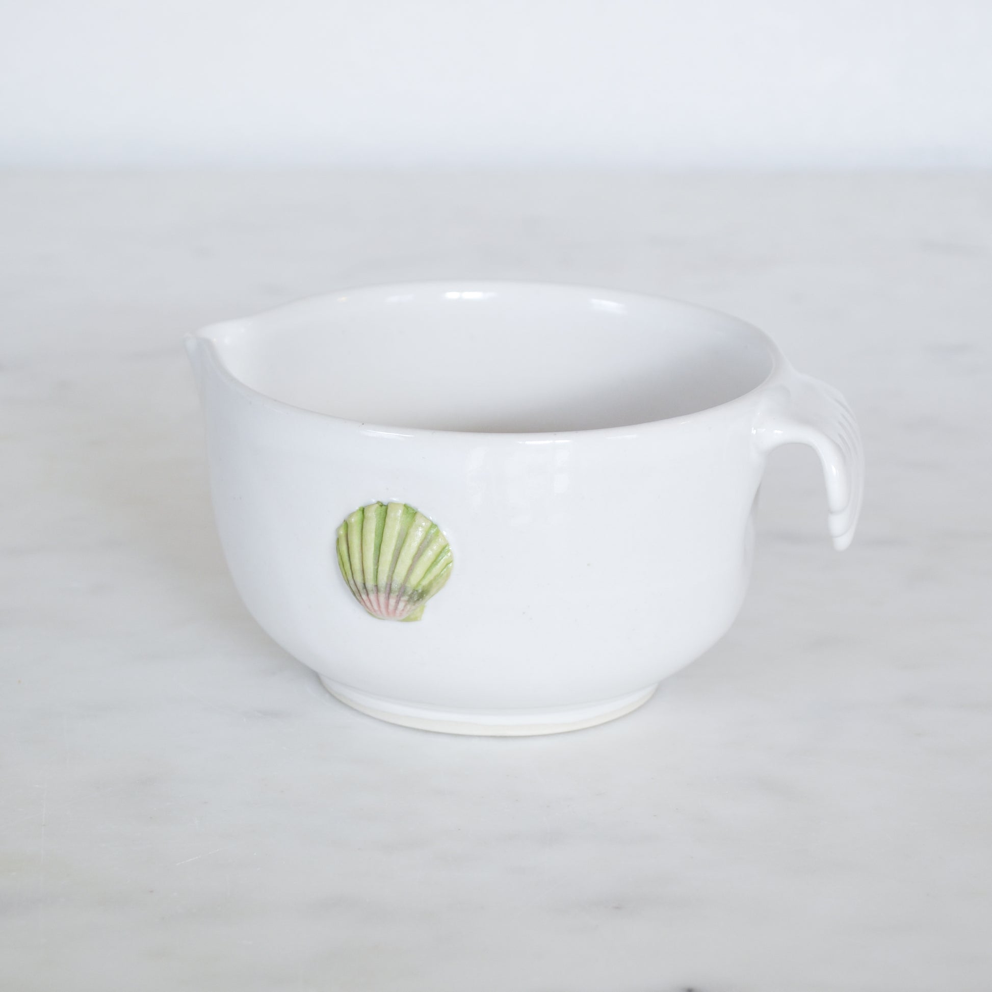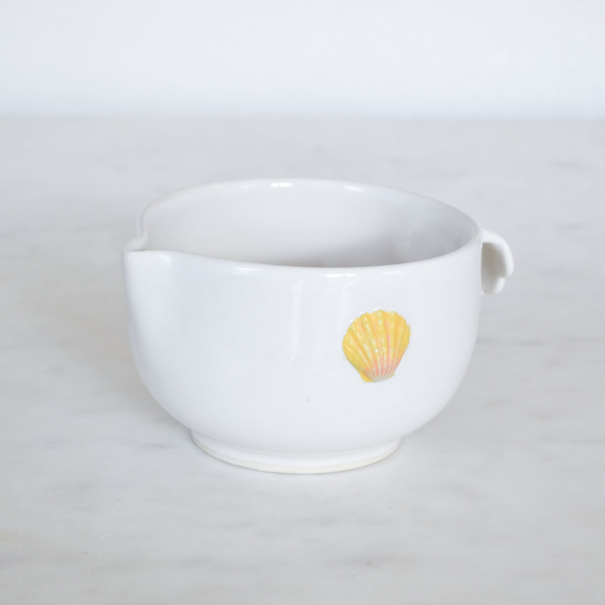 Sunrise Shell Matcha Bowl is wheel thrown, hand painted, crafted with care by Courtney Puig. It holds around 16-18 oz and features two Sunrise Shells. It is dishwasher and microwave safe. Each piece is wheel thrown and varies slightly. Width: 6", Height: 3.25"