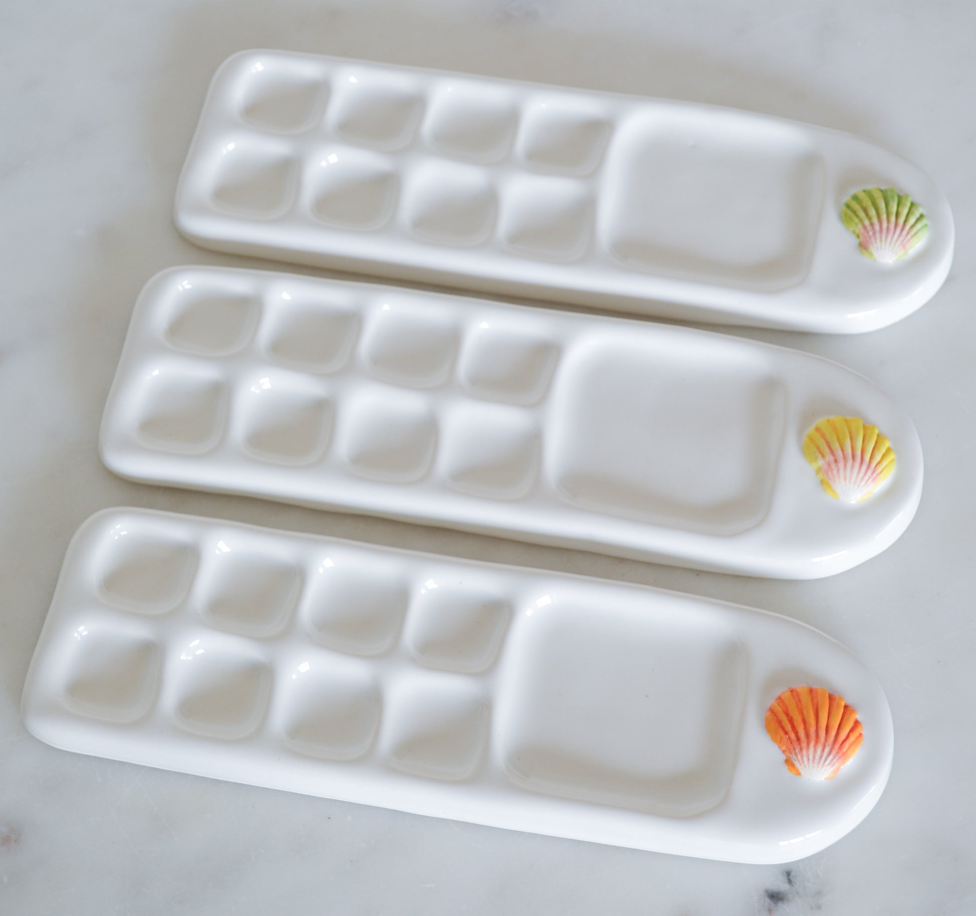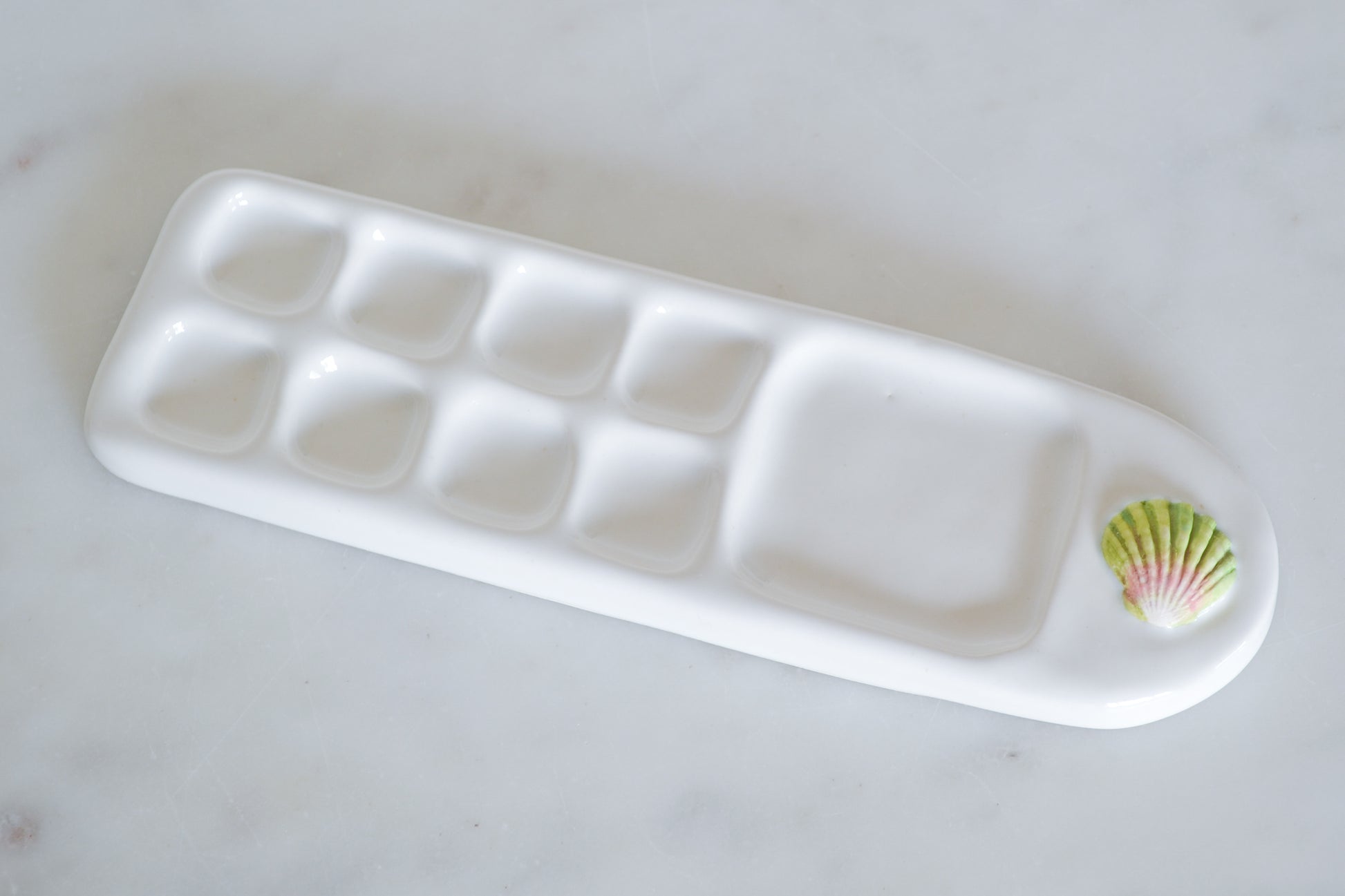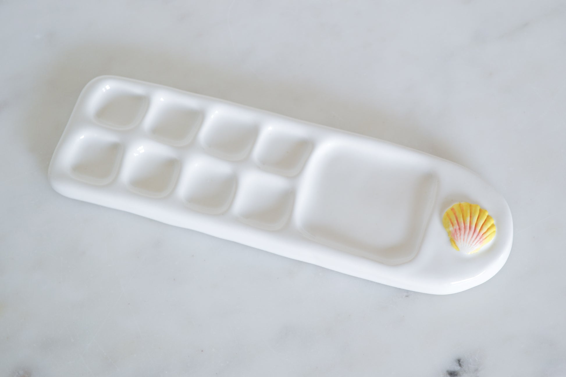 The Sunrise Shell Paint Palette is carefully hand-painted with glazes and makes a great gift for the artist in your life. Hand-cast porcelain and thoughtfully designed and made by Courtney Puig. Dimensions 8" x 2.5" , large square is 2", and smaller squares are 1".