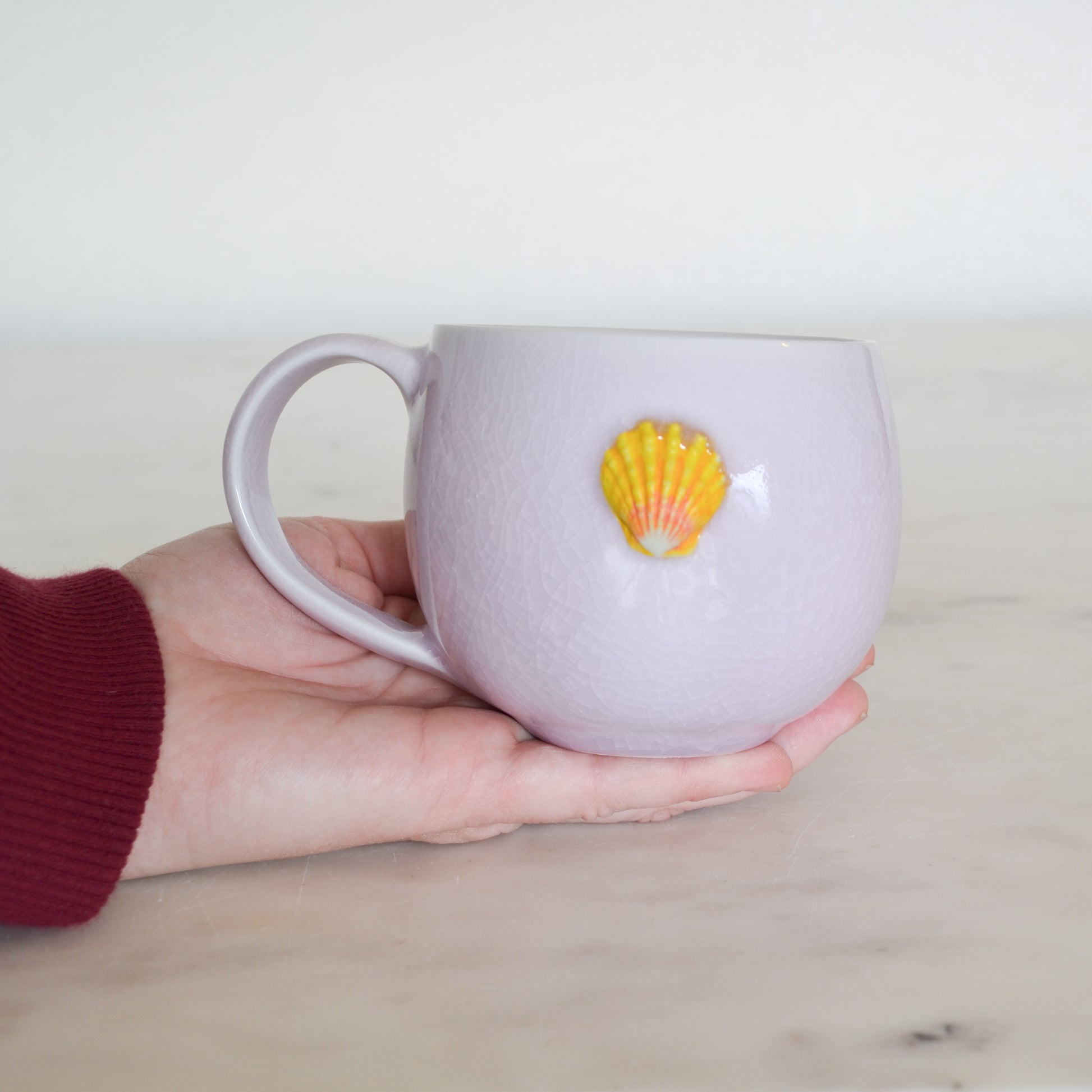 Each mug holds around 14-16oz and features two Yellow Sunrise Shells. They are dishwasher and microwave safe. Each piece is wheel thrown and varies slightly. Two styles available: Rounded Width: 3.75", Height: 3.5" Handle Interior: 2" and Classic Width: 4", Height: 3.5" Handle Interior: "2