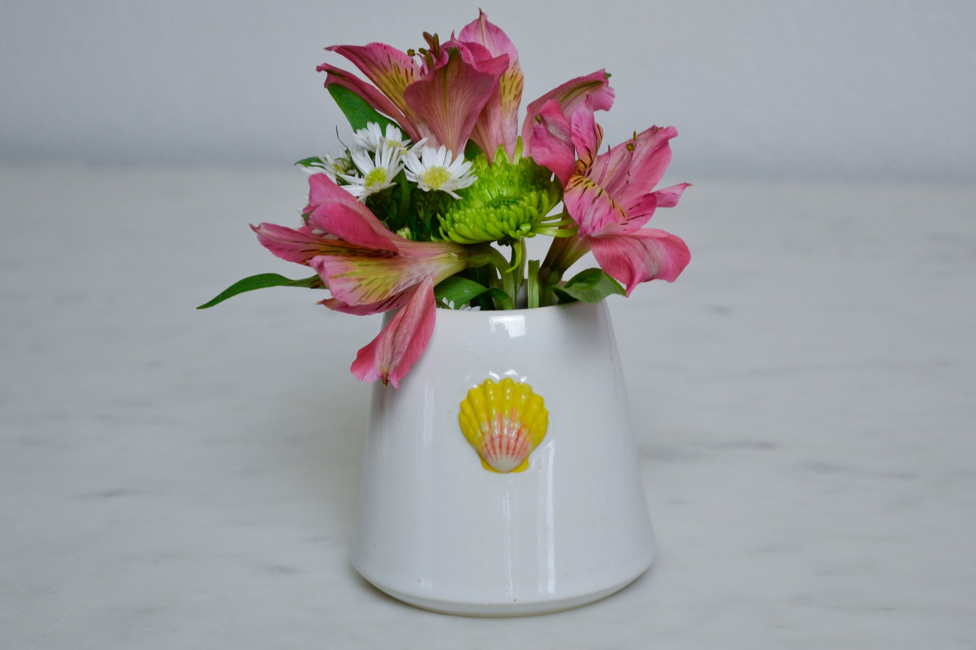 Bud Vase with Sunrise Shell. Wheel thrown and crafted with care by Courtney Puig.